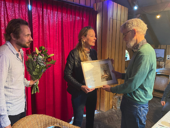Na een welkomstwoord door voorzitter Reint Huizenga werd door Nicole Bakker, directeur van De Hollandsche Molen (DHM) en Johan van Dijk, voorzitter commissie Erkenningen van de DHM het Certificaat van Verdienste aan Grieto uitgereikt vanwege zijn inzet en verdiensten voor de oude culturele molens, het behoud ervan en het ambacht van molenaar. Tevens waren aanwezig Roeli Broekhuis, directeur Erfgoedpartners in Groningen, enige huidige & oud- bestuursleden en zijn collega’s van Stel’s Meuln te Harkstede, die Grieto een ludiek cadeau overhandigden.