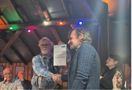 Wethouder Annemiek Hoesen van de Gemeente Midden-Groningen is er, en spreekt haar lof uit voor Martin en de MsMOG. Namens De Hollandse Molen ontvangt Martin het Blijk van Waardering. Maar dan zijn we er nog niet: Johan van Dijk, de voorzitter van de afdeling Groningen van het Gilde van Molenaars, is er ook en overhandigd Martin het allereerste Certificaat van Verdienste van de afdeling. MsMOG voorzitter Reint Huizenga memoreert de 12 jaren die Martin op onze molen Entreprise heeft gewerkt en overhandigd hem hiervoor een gegrafeerd kristal als herinnering aan onze Stichting.